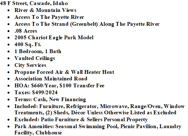 ON THE POND! 1 Bedroom/1 Full Bath, enjoy peaceful pondside living in this well-maintained park model. Featuring oak flooring, a metal roof, newer furnace, and updated tub/shower insert, this home is move-in ready. Step onto the large covered deck and take in tranquil water views—perfect for birdwatching and relaxing. Direct access to the walking path around the ponds is just outside your door. HOA fees include water, sewer, garbage, road maintenance (with snow removal), and access to amenities: clubhouse, indoor seasonal pool, gym, laundry, and shower facilities. Located just minutes from downtown Cascade, Lake Cascade, The Strand Greenbelt, Kelly’s Whitewater Park, the Rec Center, and scenic trails. Schedule your visit today! $174,900 (543113) (98952335) (enlarged home image) (park model right on the pond) (backs up to common area pond) (nicely shaded) (main living area) (living room area) (kitchen with lots of storage) (dining area) (kitchen & dining area) (looking down hallway towards bedroom) (bedroom) (lots of storage space in the bedroom) (full bath) (new shower insert) (storage shed included) (enjoy those evenings on your covered deck) (well maintained, surrounded by mature trees) (quick access to the payette river) (quick access to the strand greenbelt along the payette river) (common area with pond & mountain views) (community seasonal swimming pool) (community laundry facility) (community gym) (community clubhouse) (entrance into leisure time rv park) (additional information) (plat map) (county map) (Leisure Time RV Park Area Page) (City of Cascade Area Page) (Waterfront or Water View Page) Map Location |