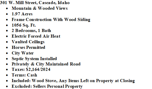 QUAINT MOUNTAIN PROPERTY with Great Potential! Finish this charming 2BR/1BA home on 1.97ac nestled in the woods with mountain views and close to town. Septic, public water, and power are already in place. Just over 1,000 SF—ideal for year-round living, a weekend getaway, or an investment opportunity. For the right buyer this is a great chance to create something special in a peaceful mountain setting! $249,900 (543675) (98966179) (enlarged home image) (mountain & wooded views) (mountains to the east) (back of home) (wooded setting) (looking north) (looking up at home) (living area) (part of living room area) (kitchen area in back right of photo) (downstairs bedroom #1) (3/4 bath) (views from upstairs) (bedroom #2 upstairs) (driveway up to house) (additional information) (plat map) (county map) (City of Cascade Area Page) Map Location NEW LISTING! |