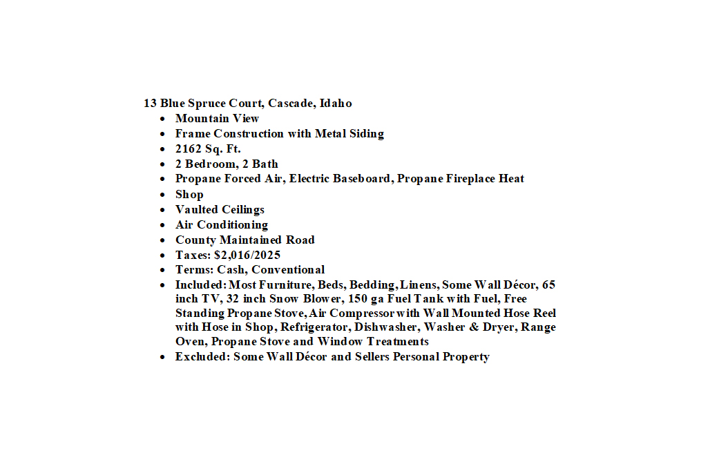 | STUNNING MOUNTAIN VIEWS set the stage for this beautifully maintained home, cherished by generations of family and ready for its next chapter. Nestled on 2.31 acres, this 2,162 sq ft residence offers comfort, space, and exceptional versatility including a 1,200 sq ft insulated and heated shop/garage perfect for hobbies, storage, or workspace. The main level features two spacious bedrooms, two full bathrooms, a bright living area, kitchen, dining space, laundry room, and a gorgeous sunroom designed to capture the surrounding views. Upstairs, you’ll find a large open loft plus a separate bonus room, ideal for guests or an office. Stay comfortable year-round with air conditioning for warm summer days and a cozy propane stove for chilly winter evenings. Additional highlights include most furnishings and a 54” TV, a built-in emergency generator bypass system, paved driveway with RV parking featuring 15-, 30-, and 50-amp service, an outdoor fire pit, automatic exterior lighting, a 150-gallon fuel storage tank, partially sheeted flooring and windows for venting in garage attic and so much more. For expanded possibilities, an additional 2.65-acre lot is available for $175,000. $749,000 (544033) (98977597) (enlarged home image) (beautiful setting) (garage & shop) (great deck for bbq's) (open layout great views) (picturesque views) (east mountain views) (mountain views) (mud & laundry room) (bedroom on main floor) (bath main floor) (main floor bath) (main floor primary suite) (primary suite main floor) (ensuite full bath) (ensuite main floor) (great use of space) (mix of wood & sheetrock) (kitchen & breakfast bar) (dining area) (living area) (cozy bonus space) (light filled with views) (naturally light) (vaulted ceilings) (loft hangout) (multi use loft) (upstairs bonus room) (versatile bonus space) (lots of parking) (paved driveway) (night at home) (sunset at home) (additional information) (plat map) (county map) (Homes & Cabins Page) Map Location PENDING |
