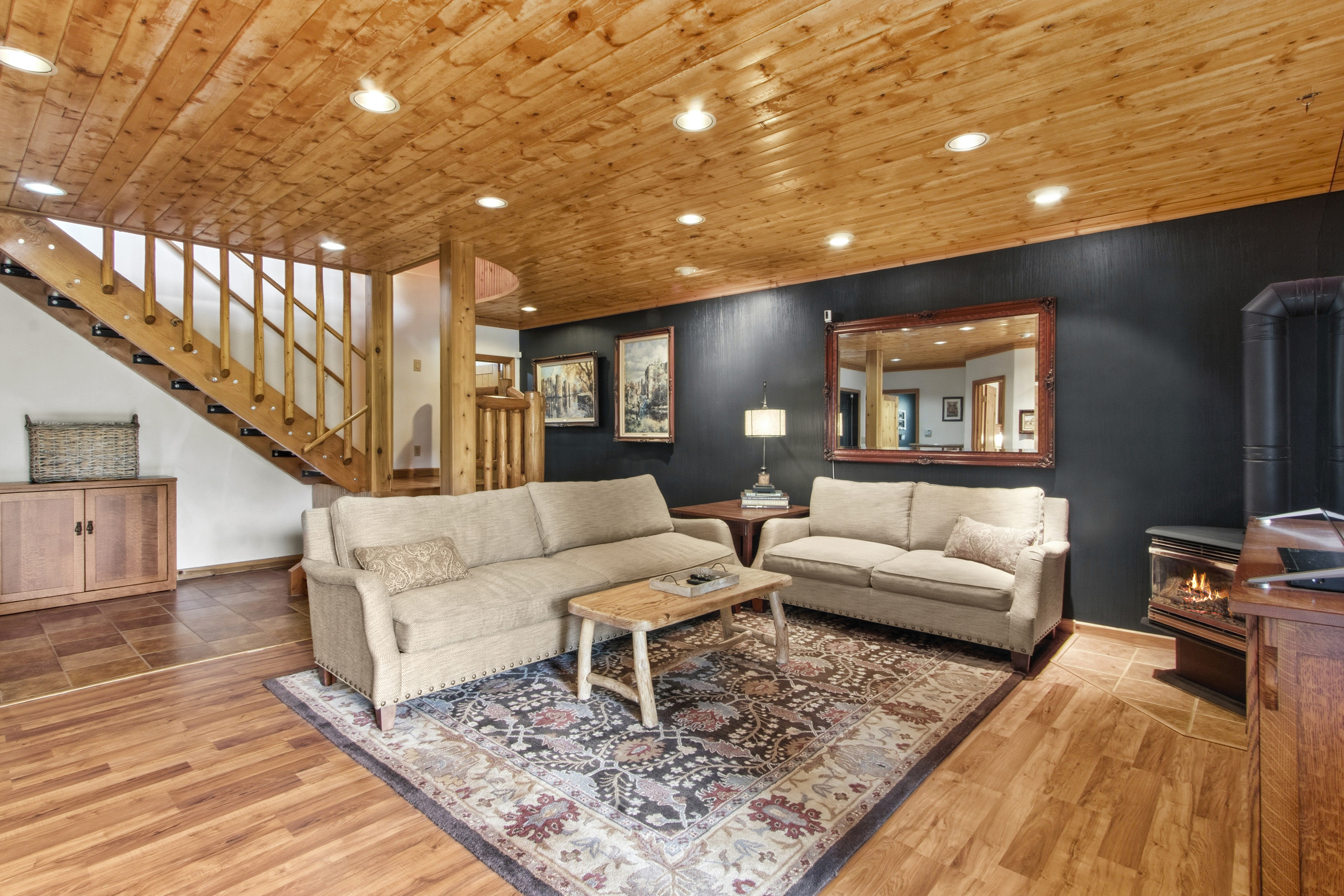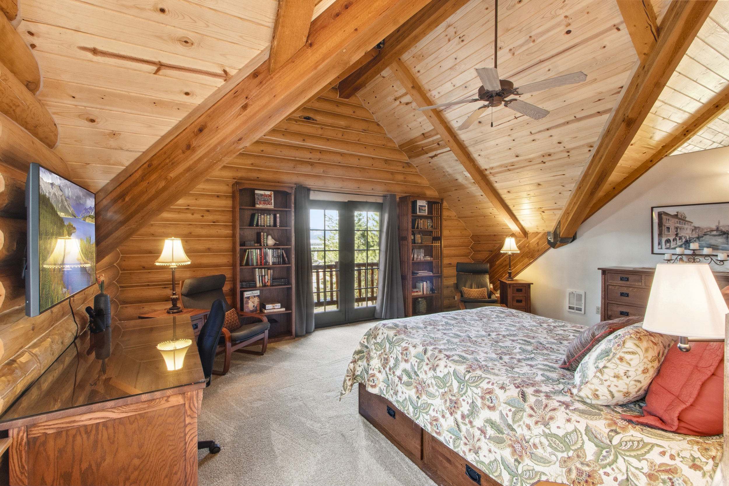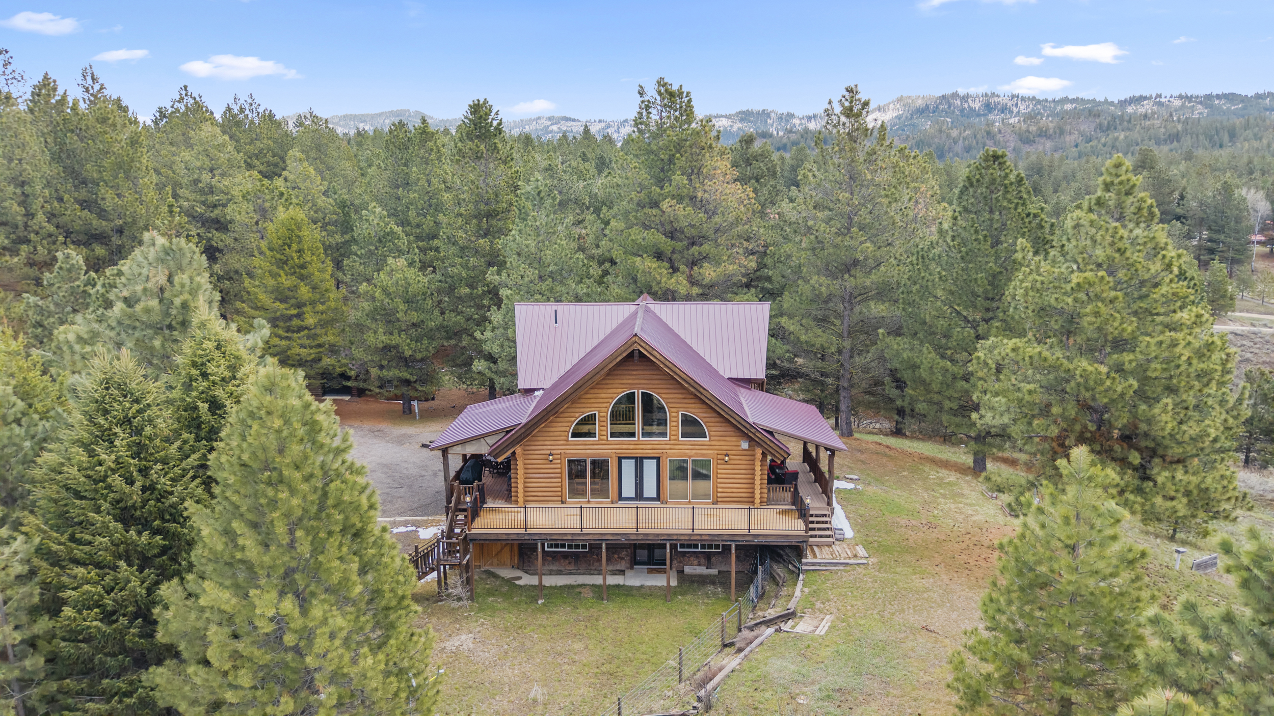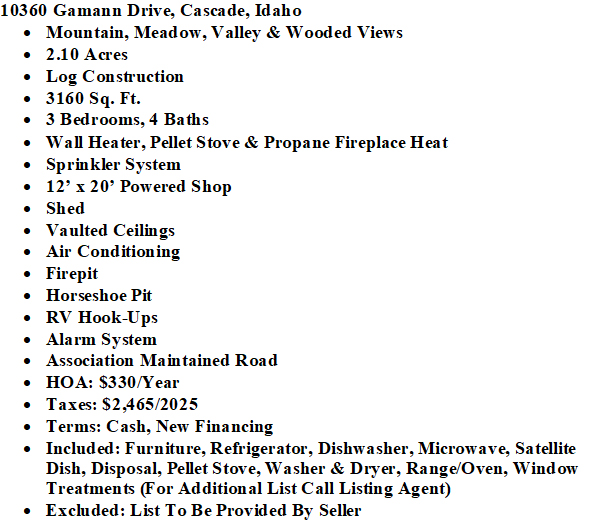 | STUNNING MOUNTAIN AND VALLEY VIEWS - from this beautifully crafted 3-level log home offering 3,160 sq ft of inviting living space. Featuring 3 bedrooms / 4 baths, including 2 primary suites, this property is designed for comfort and flexibility. Vaulted T&G ceiling and Hickory wood floors in the main living area and other gathering areas provide room to spread out, relax or entertain. The kitchen is well-equipped with a 5-burner gas range and a separate electric oven. Enjoy outdoor living with a large front deck, two spacious side decks, and a private deck off the upstairs primary suite—all perfect for taking in the magnificent scenery. This special property is situated on 2.10 acres with fire pit, horseshoe pit, RV hookup, a 12x20 powered shop, shed and ample space for all your toys. Most furnishings are included for a turnkey opportunity. This property is the perfect base camp to begin all your Valley county recreation opportunities. $1,100,000 (544257) (98982834) (enlarged home image) (log home) (beautiful setting) (living area) (main floor living area) (dining area main floor) (kitchen main floor) (kitchen with 2 ovens) (kitchen) (main floor 1/2 bath) (mud room) (bedroom main floor) (bath in bedroom main floor) (primary suite upstairs) (primary suite) (primary suite bath) (upstairs primary bath) (game area loft) (living area downstairs) (downstairs bedroom) (downstairs bath) (laundry room) (lots of parking) (2nd garage & shed) (north side deck) (side deck with views) (looking west & south) (entrance to property) (views) (mountains all around) (gorgeous home) (additional information) (plat map) (county map) (Homes & Cabins Page) Map Location |