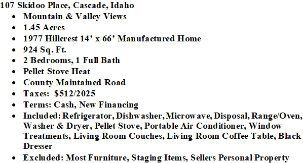 | CHARMING 1977 manufactured home situated on 1.45 acres, offering plenty of room to relax and enjoy the surrounding beauty. Take in stunning mountain and valley views right from your property. Large windows in the master bedroom and dining areas fill the home with natural light, creating a warm and inviting atmosphere. Conveniently located just 15 minutes from downtown Cascade, you’ll have easy access to dining, amenities, and year-round recreation. Outdoor enthusiasts will also love the close proximity to Herrick Reservoir for fishing, exploring, and enjoying the great outdoors. $300,000 (544077) (98978796) (enlarged home image) (parking area & front entry) (mud room) (living room) (washer & dryer included) (updated lvp flooring in bath) (full bath) (entrance to primary from bath) (primary bedroom) (kitchen) (unique oval kitchen) (lots of natural light) (dining area) (short distance away from herrick reservoir) (additional information) (plat map) (county map) (Homes & Cabins Page) Map Location |