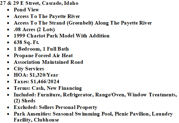 LEISURE TIME, own your own camp site or park model with community swimming pool, picnic pavilion, laundry facility and access to the Payette River and the greenbelt "The Strand".